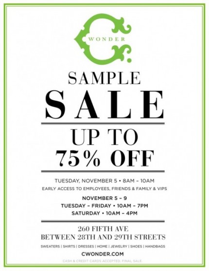 C. Wonder Sample Sale Tuesday, November 5th – Friday, November 8th 10AM – 7PM Saturday, November 9th 10AM – 4PM…