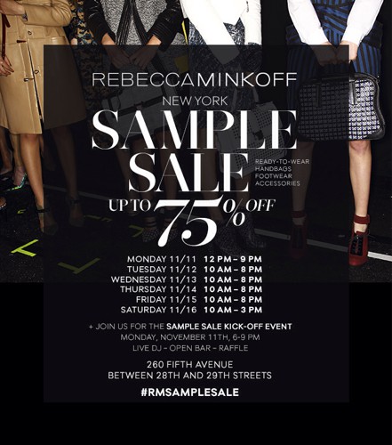 Rebecca Minkoff Sample Sale November 11th – 16th, 2013 Up to 75% Off *Sample Sale Kick-Off Event on Monday November 11th, 6…