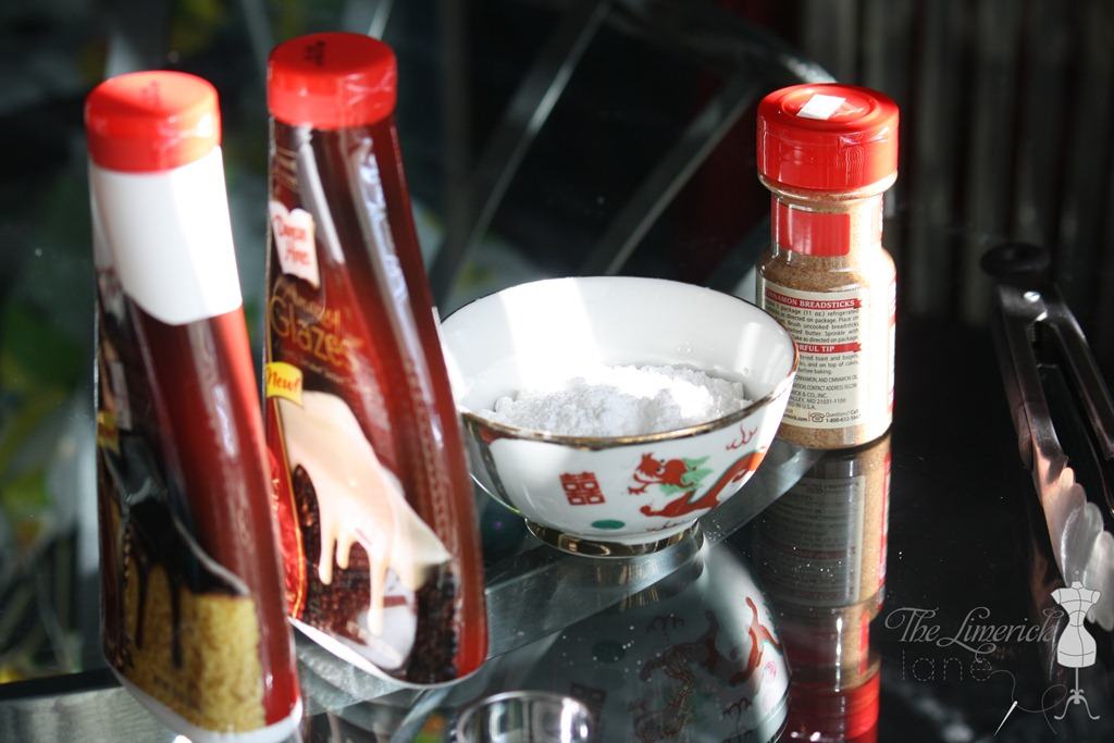 We used Duncan Hines Amazing Glazes, confectioner sugar and cinnamon sugar as toppings. Here is a coupon for $1.00 off the Duncan Hines Glaze, if you would like to try them out.