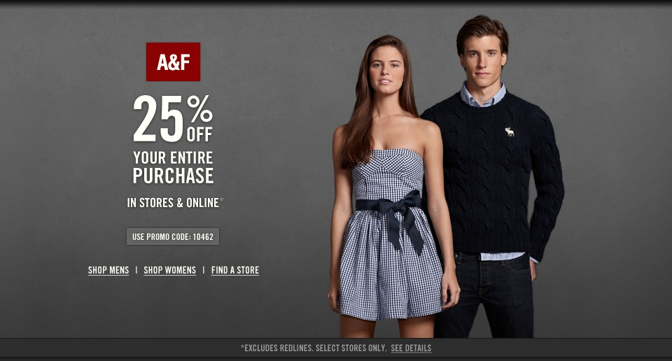 Take 25% off entire purchase at Abercrombie & Fitch. Use code 10462 at checkout. Coupon expires 1.29.12.