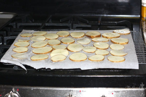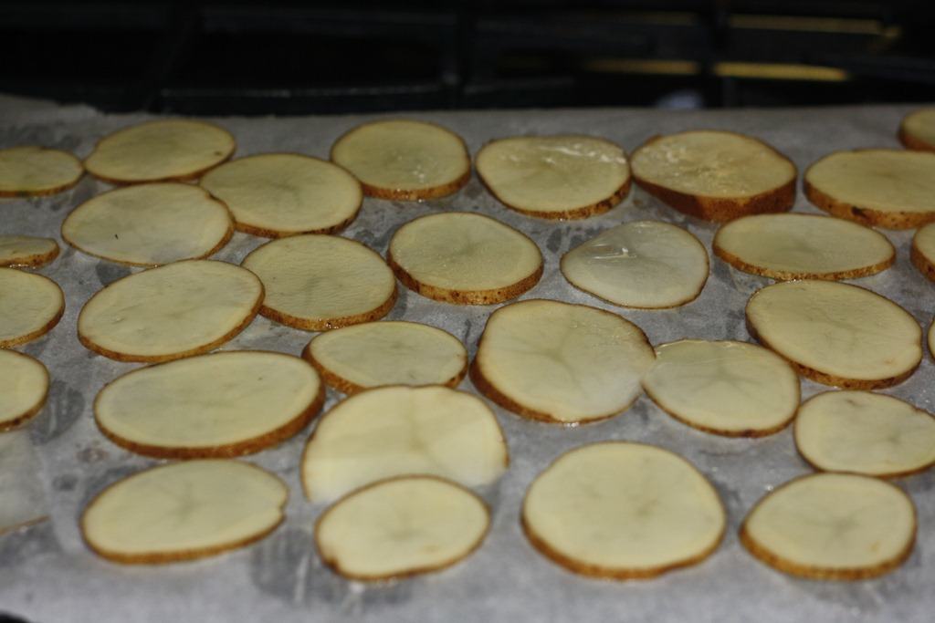 Arrange potato slices in a single layer on top of parchment paper. Be sure not to overlap the edges of the potatoes.