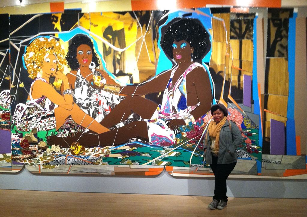 I remember walking past that window one late night and seeing a huge display of three beautiful black women with natural hair.  The image stopped me dead in my tracks.  I loved everything about it.  Her use of rhinestones gave it a beautiful texture and sparkle.  Since the museum was closed, I couldn’t go in and inspect the installation further.  So I took a picture of the window and ran home to Google her. That night my love for Mickalene’s art was born.