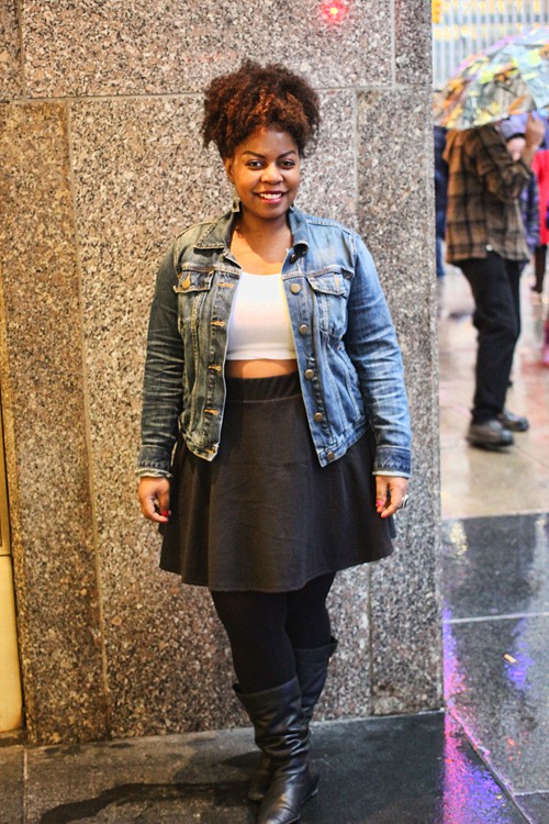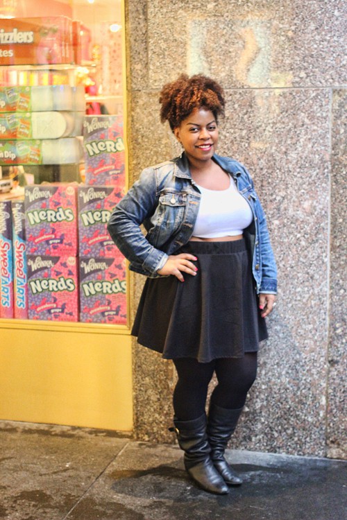Wearing: Gap Denim Jacket | No Name Crop Top | Forever 21 Skirt | Hanes Tights | Steve Madden Knee High Boots