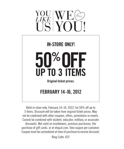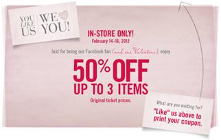 Go to The Limited Facebook page to “like” and become a fan. You will get a coupon for 50% off up to 3 regular priced items. This coupon is valid today only!!