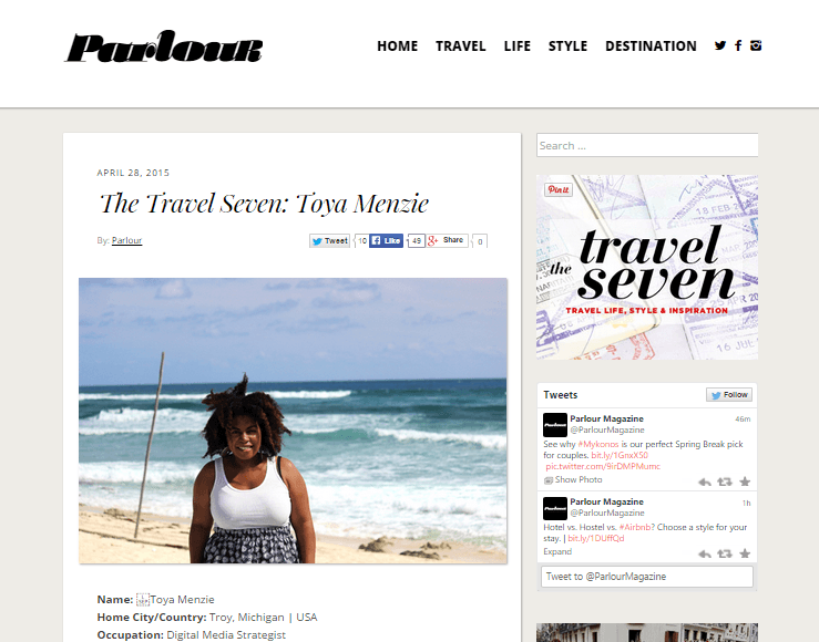 Hey friends! I still have much more to write about my Italian tour, but I just have to tell you about my recent feature on Parlour Magazine. I am so stoked. Parlour Mag is one of my favorite travel sights for women of color. They offer great travel tips, the stories are relatable and it’s just good to see my sistahs traveling around the globe. We are doing it….and doing it big. Check it out!