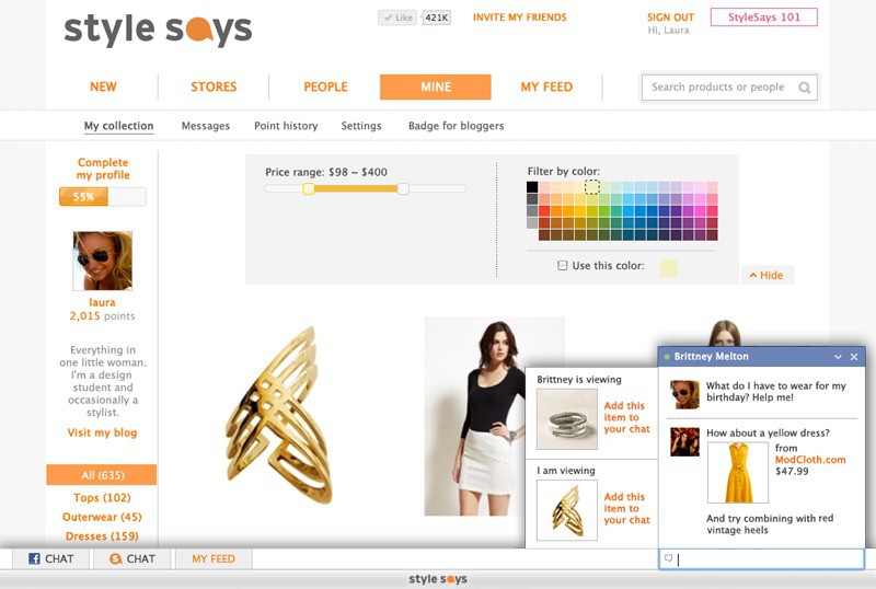 Soon there after StyleSays was born. For about the the last two weeks I’ve set up numerous shopping dates with friends. We’ll go online and browse hundreds of items, while catching up on each other’s lives. And now I can get a trusted opinion on items I’m unsure about without having to wait for on an email.